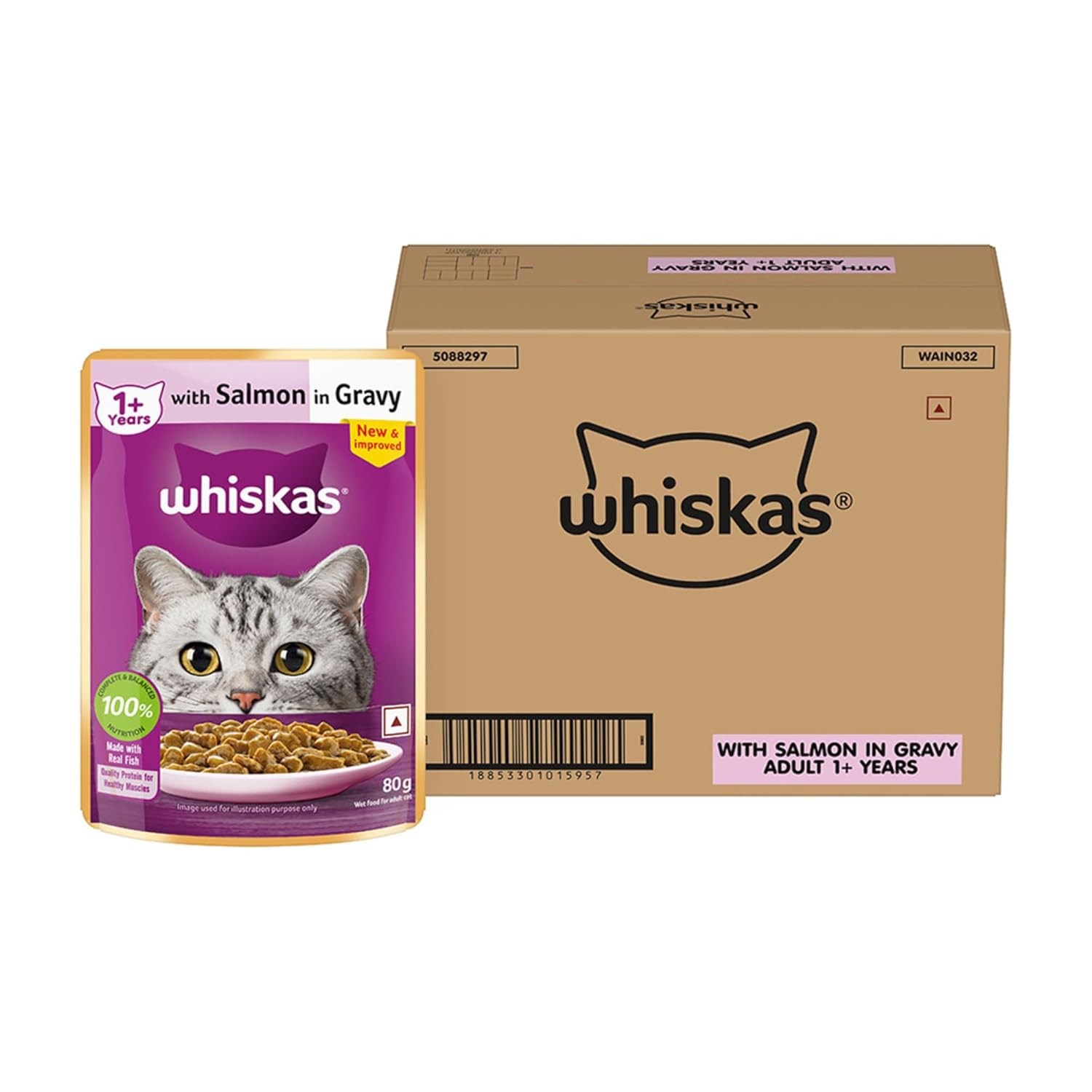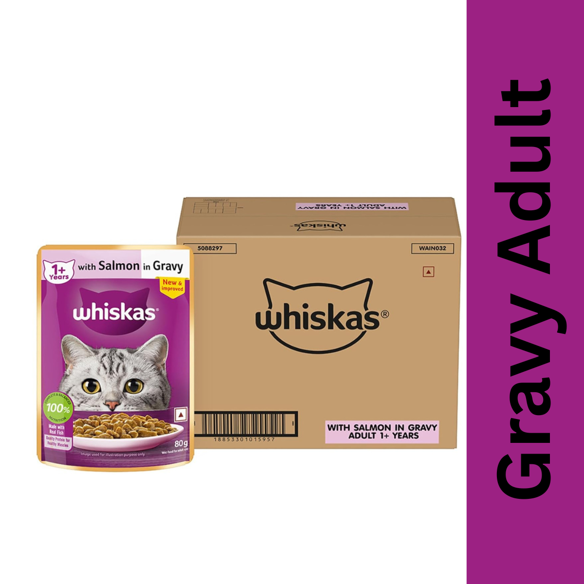 Whiskas Adult (1+ Years) Wet Cat Food, Salmon in Gravy, 80 gm
